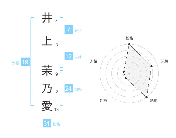 井上 茉乃愛さんを姓名の画数から五運を鑑定