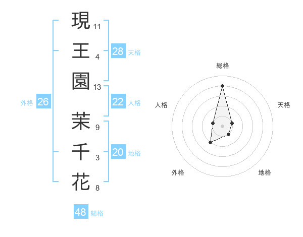 現王園 茉千花さんを姓名の画数から五運を鑑定