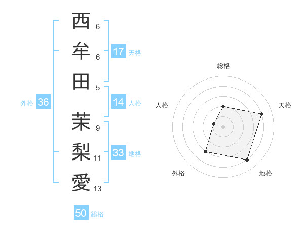 西牟田 茉梨愛さんの総格は50画の2点