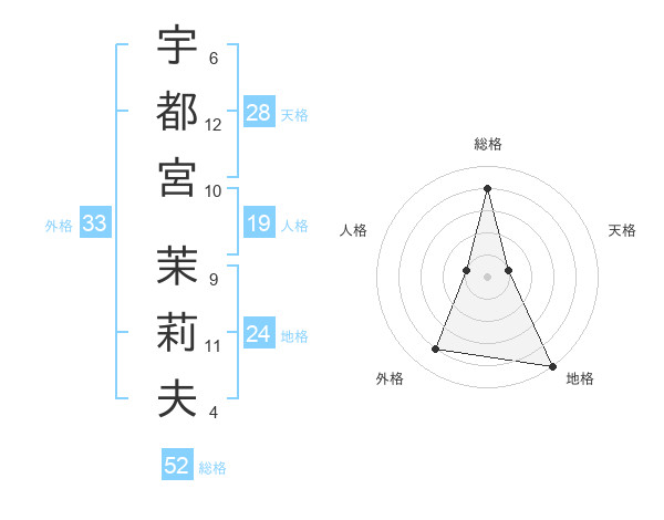 宇都宮 茉莉夫さんの総格は52画の4点!