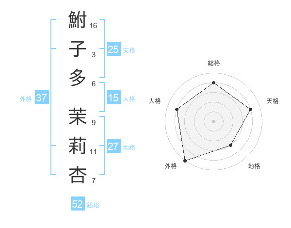 鮒子多 茉莉杏さんの総格は52画の4点!