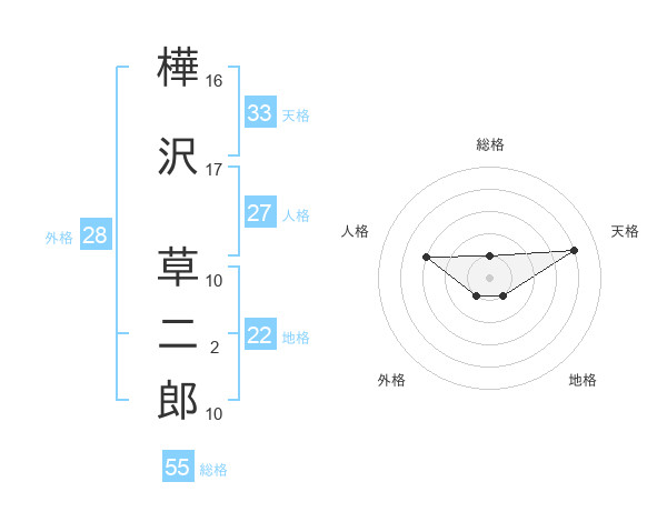 樺沢 草二郎さんの総格は55画の1点!