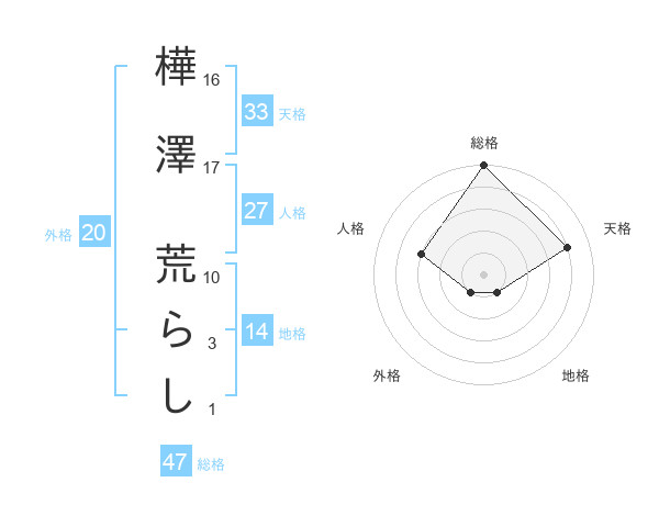 樺澤 荒らしさんを姓名の画数から五運を鑑定