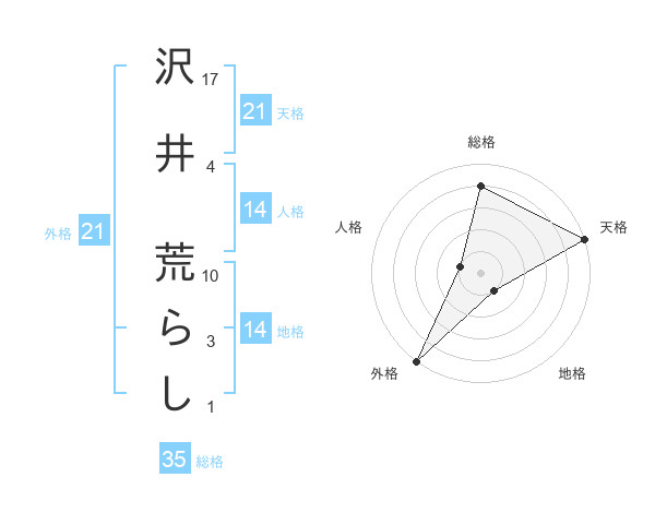 沢井 荒らしさんを姓名の画数から五運を鑑定