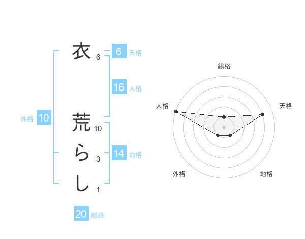 衣 荒らしさんの総格は20画の1点!