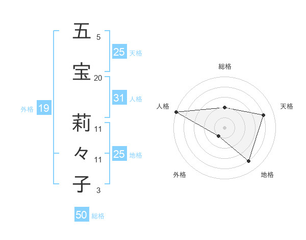五宝 莉々子さんを姓名の画数から五運を鑑定