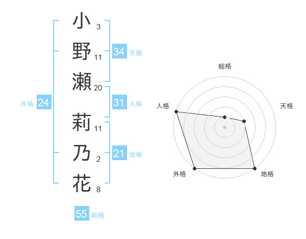 小野瀬 莉乃花さんの外格は24画の5点!