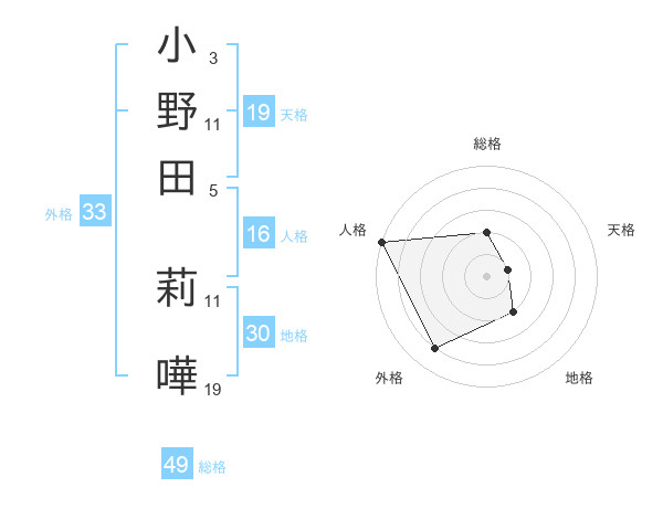 小野田 莉嘩さんの総格は49画の2点!