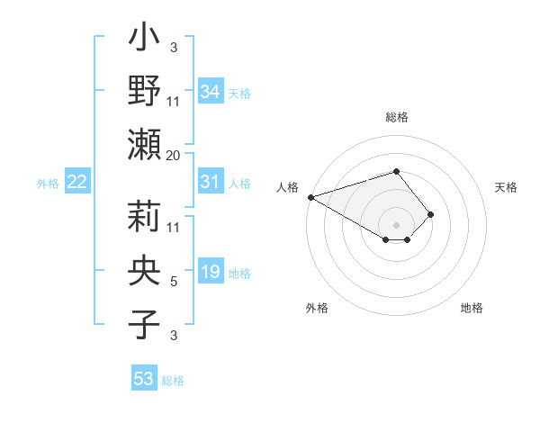 小野瀬 莉央子さんの総格は53画の3点