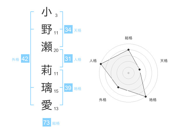小野瀬 莉璃愛さんの総格は73画の4点