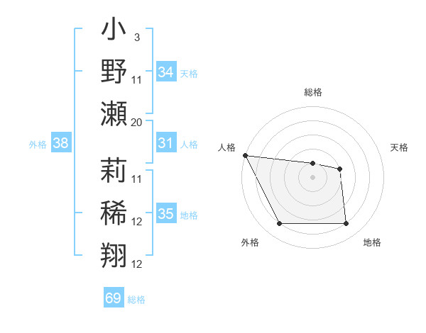 小野瀬 莉稀翔さんの地格は35画の4点!