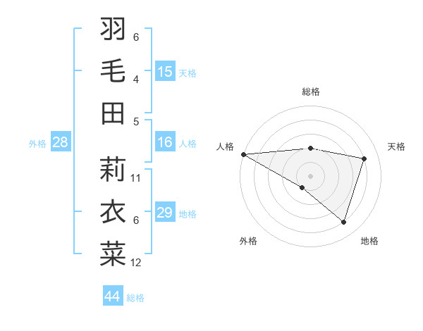 羽毛田 莉衣菜さんの人格は16画の5点