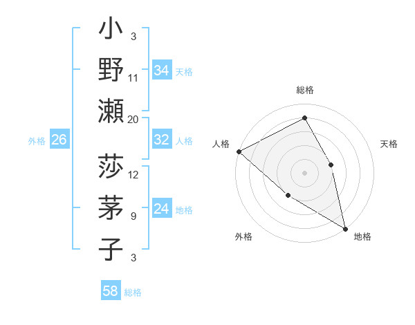 小野瀬 莎茅子さんを姓名の画数から五運を鑑定