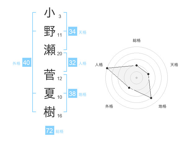 小野瀬 菅夏樹さんの総格は72画の2点!