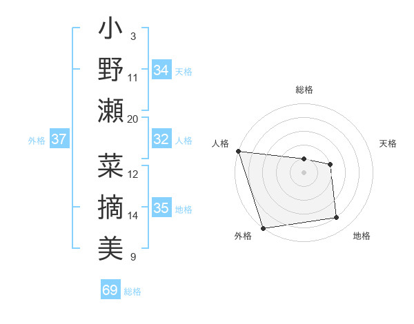 小野瀬 菜摘美さんを姓名の画数から五運を鑑定