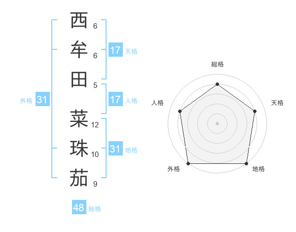 西牟田 菜珠茄さんの外格は31画の5点