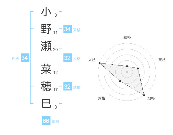 小野瀬 菜穂巳さんの地格は32画の5点!