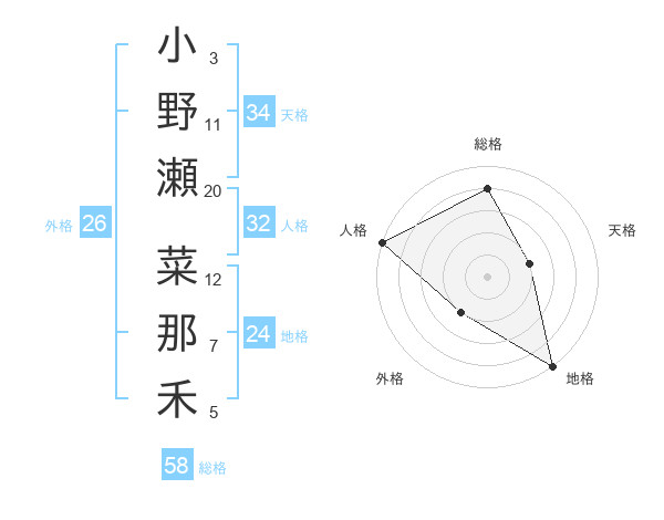 小野瀬 菜那禾さんを姓名の画数から五運を鑑定
