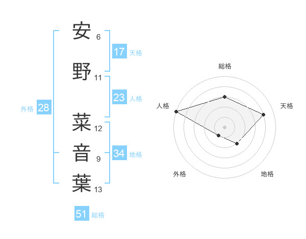 安野 菜音葉さんの総格は51画の3点!