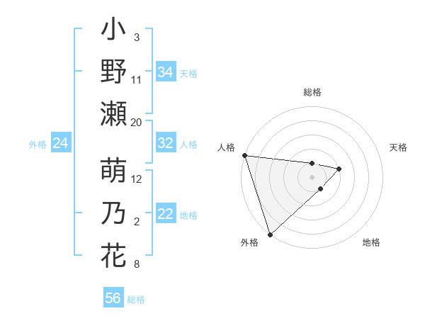 小野瀬 萌乃花さんの天格は34画の2点!