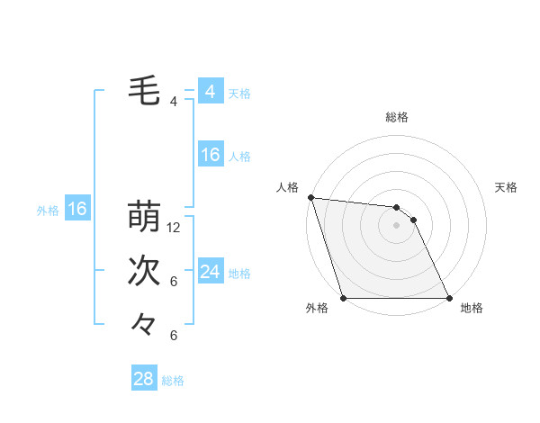 毛 萌次々さんの総格は28画の1点!