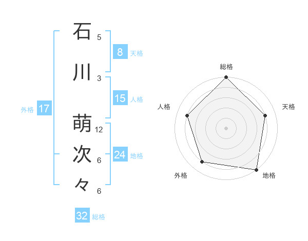 石川 萌次々さんの総格は32画の5点