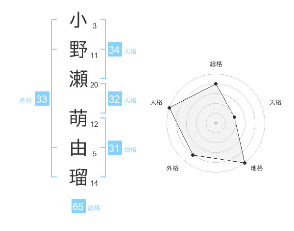 小野瀬 萌由瑠さんの総格は65画の4点!
