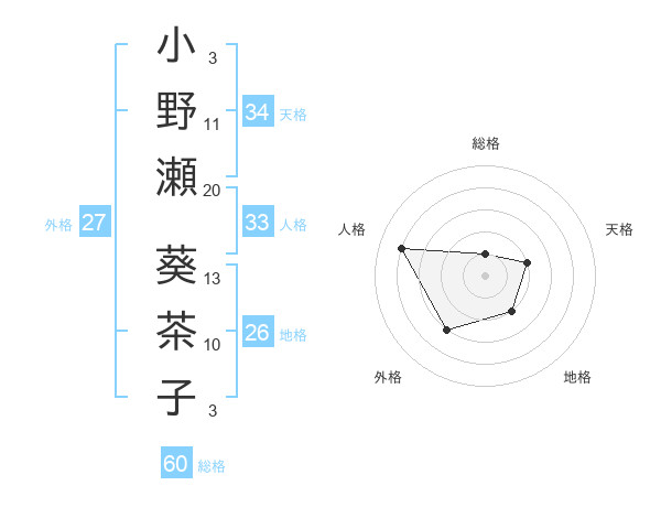 小野瀬 葵茶子さんを姓名の画数から五運を鑑定