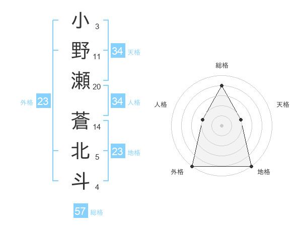 小野瀬 蒼北斗さんの総格は57画の4点!