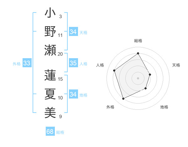 小野瀬 蓮夏美さんの総格は68画の4点!
