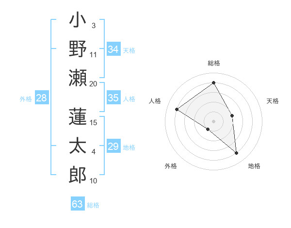 小野瀬 蓮太郎さんの総格は63画の4点!