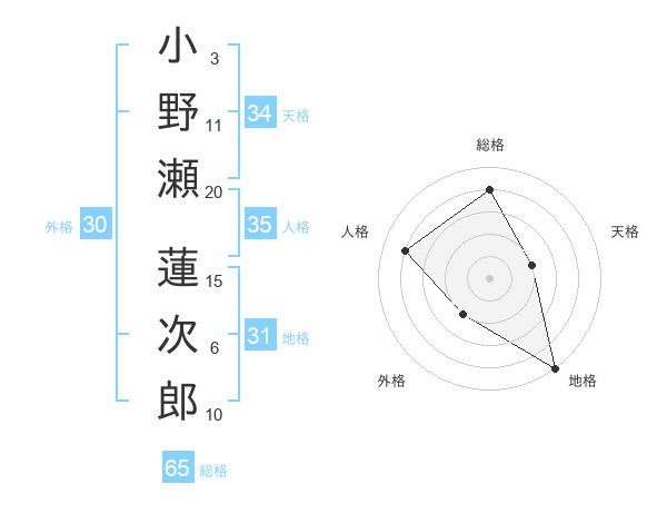 小野瀬 蓮次郎さんの総格は65画の4点!