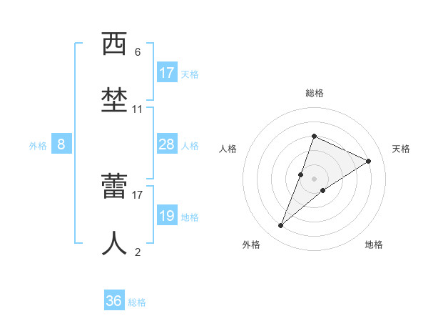 西埜 蕾人さんの総格は36画の3点!