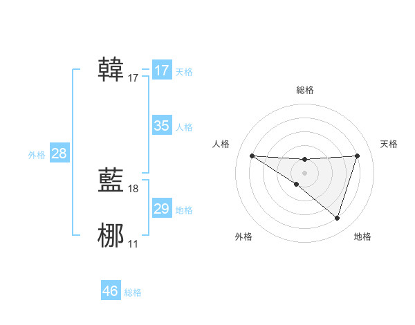 韓 藍梛さんの地格は29画の4点!