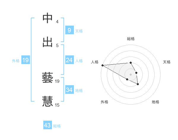 中出 藝慧さんの総格は43画の2点!