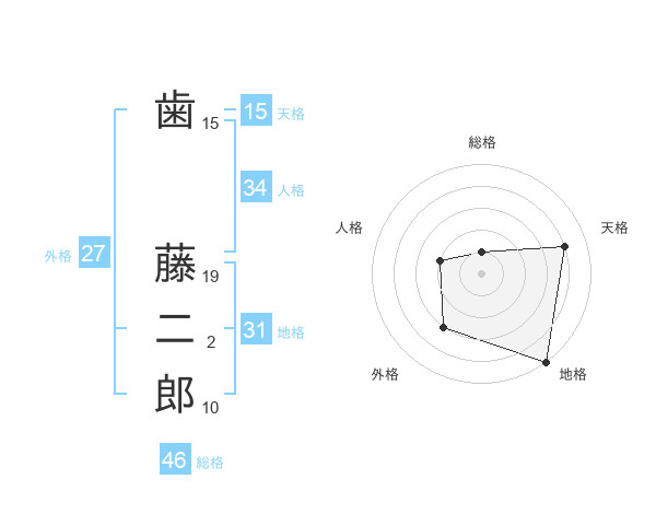 歯 藤二郎さんの天格は15画の4点!