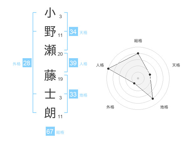 小野瀬 藤士朗さんの総格は67画の4点!