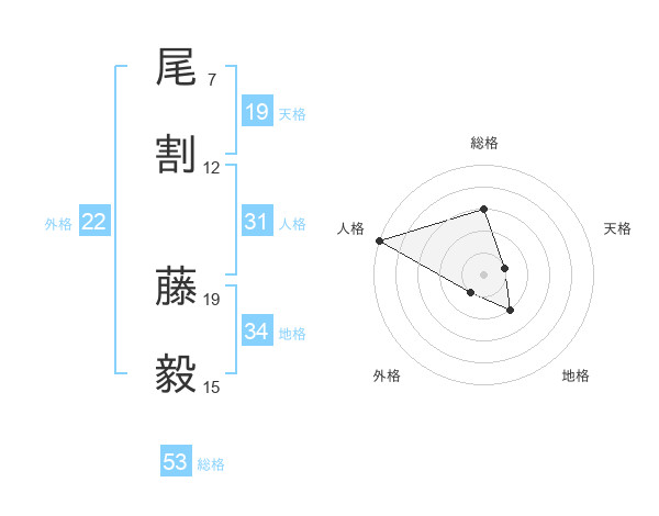 尾割 藤毅さんの総格は53画の3点!