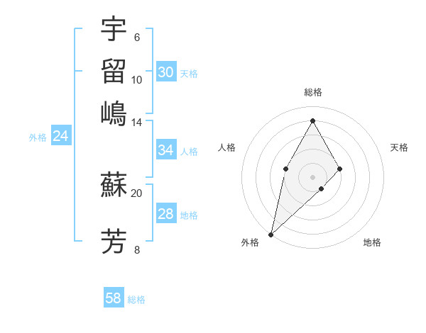 宇留嶋 蘇芳さんの総格は58画の4点!