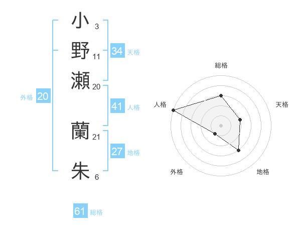 小野瀬 蘭朱さんを姓名の画数から五運を鑑定