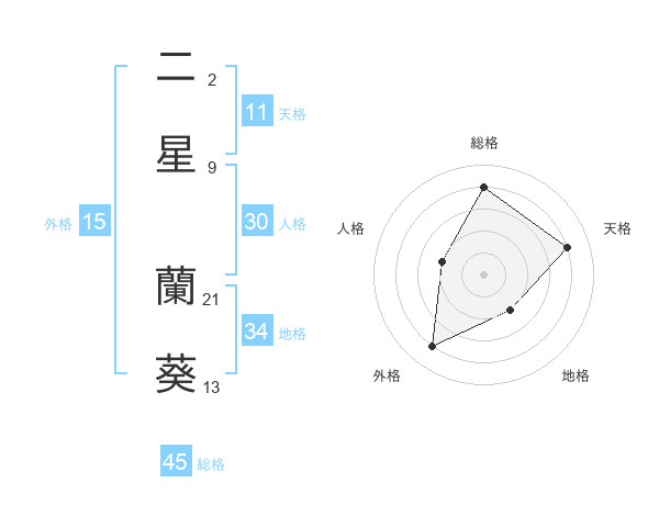 二星 蘭葵さんの総格は45画の4点!
