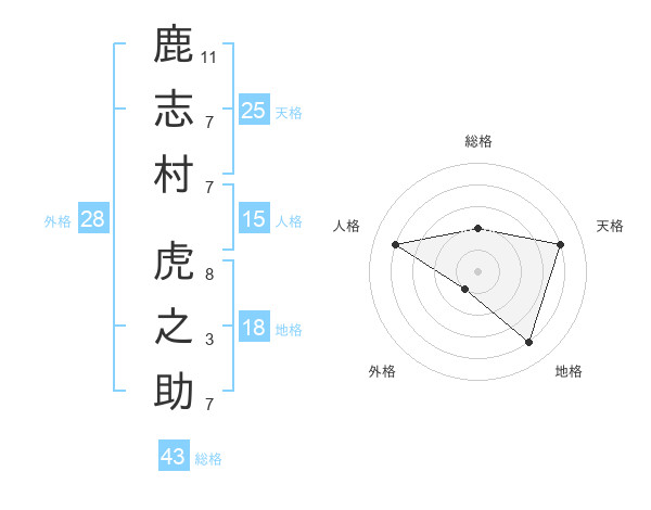 鹿志村 虎之助さんの総格は43画の2点!