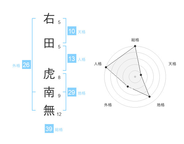 右田 虎南無さんの総格は39画の5点!