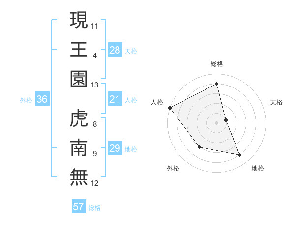 現王園 虎南無さんを姓名の画数から五運を鑑定