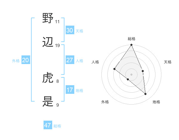 野辺 虎是さんの総格は47画の5点!
