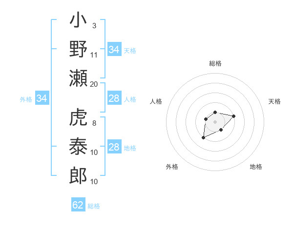 小野瀬 虎泰郎さんの総格は62画の1点!