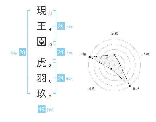 現王園 虎羽玖さんを姓名の画数から五運を鑑定