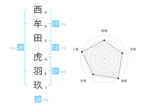 西牟田 虎羽玖さんの天格は17画の4点!