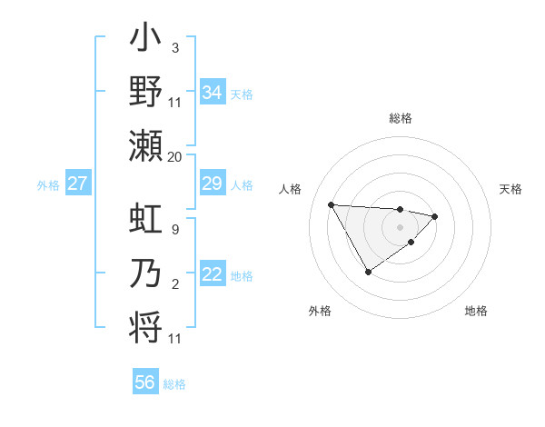 小野瀬 虹乃将さんを姓名の画数から五運を鑑定