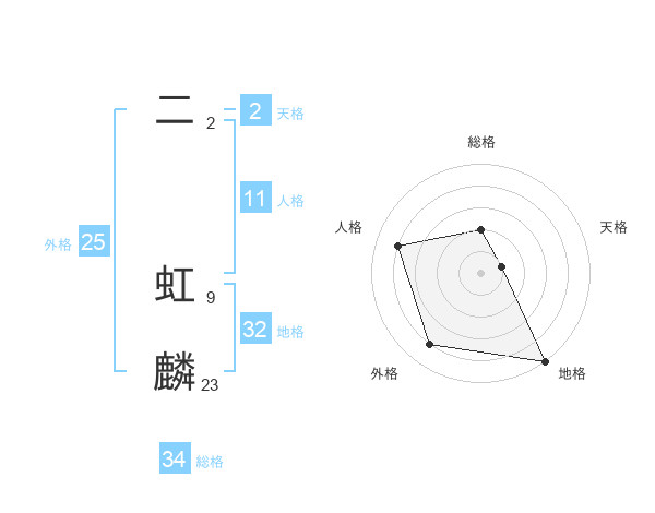 二 虹麟さんの総格は34画の2点!